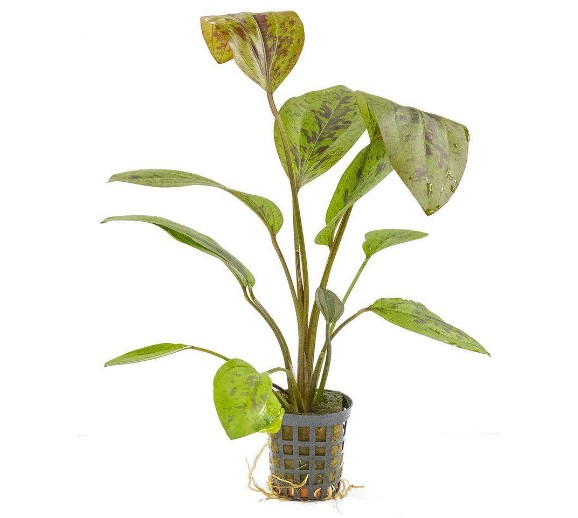 Echinodorus Sunset on vesimiekkaristeytys, jolla on pilkukkaat lehdet.