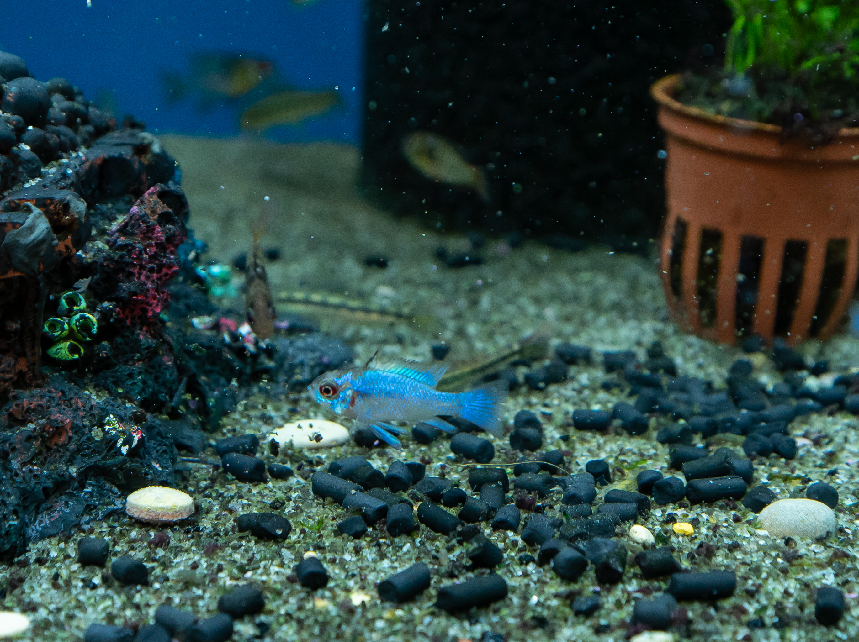 Akvaarion sisustus:Tiheää kasvillisuutta, jotta akvaariossa myös hämärämpiä alueita. Vapaata pohjatilaa keskellä. Hienorakeinen pohjahiekka. Kantoja ja koloja/luolia. Laakea n. 10x5cm litteä (tumma) kivi valitaan usein mielellään kutupaikaksi.