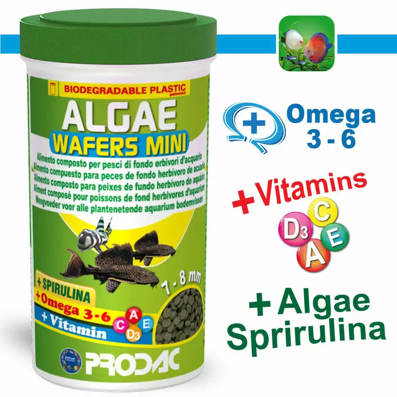Prodac algae wafers mini 100 ml/50g Pohjakalanruoka pienemmille monneille ja muille levänsyöjille. Pohjatablettiruoka pienille pohjakaloille joiden ruokavalioon kuuluvat levät / kasvit. Mini wafer... Lue lisää