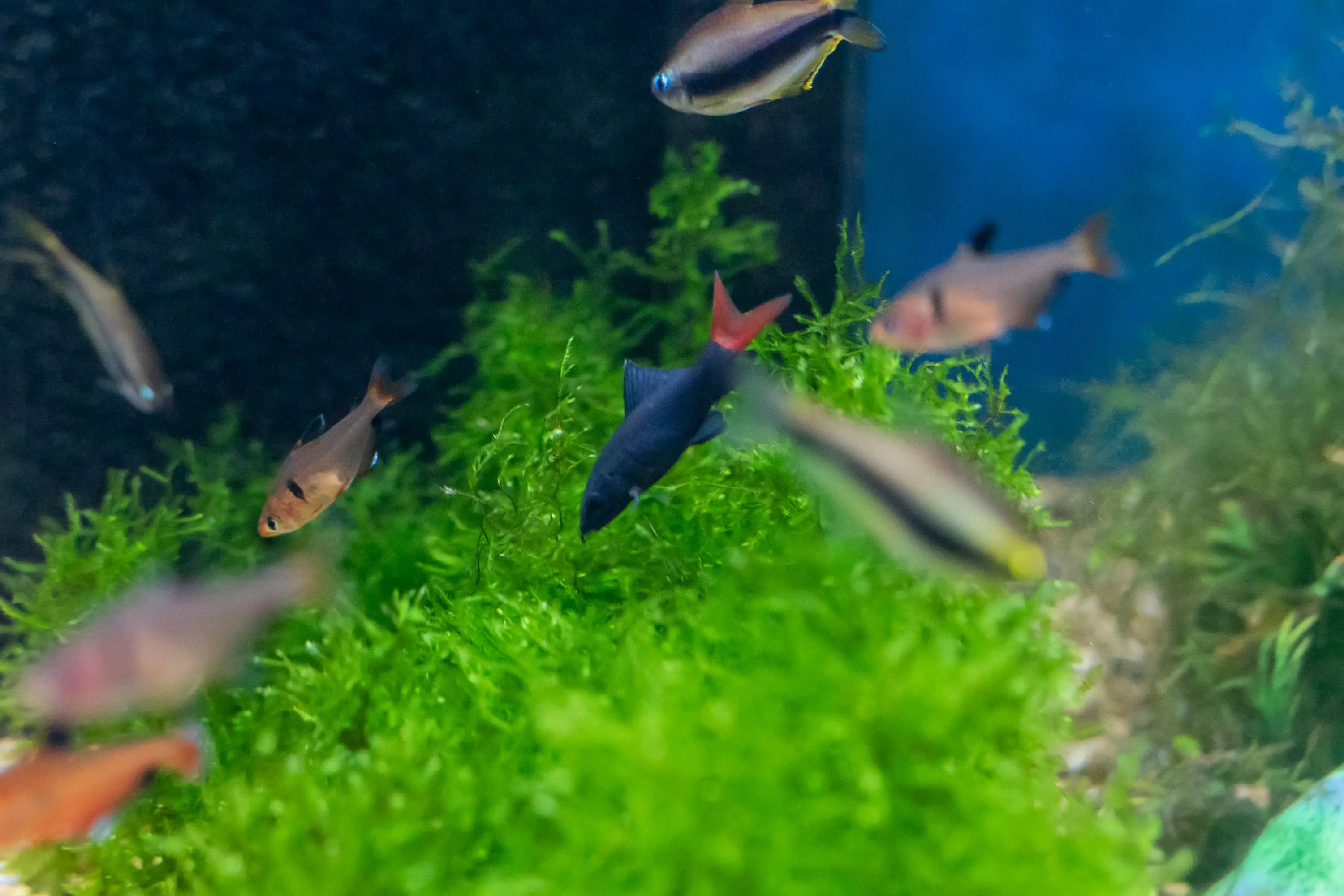 Ruokinta : sekasyöjä: hiutaleet, rakeet, pakastetut toukat, pohjatabletit.
