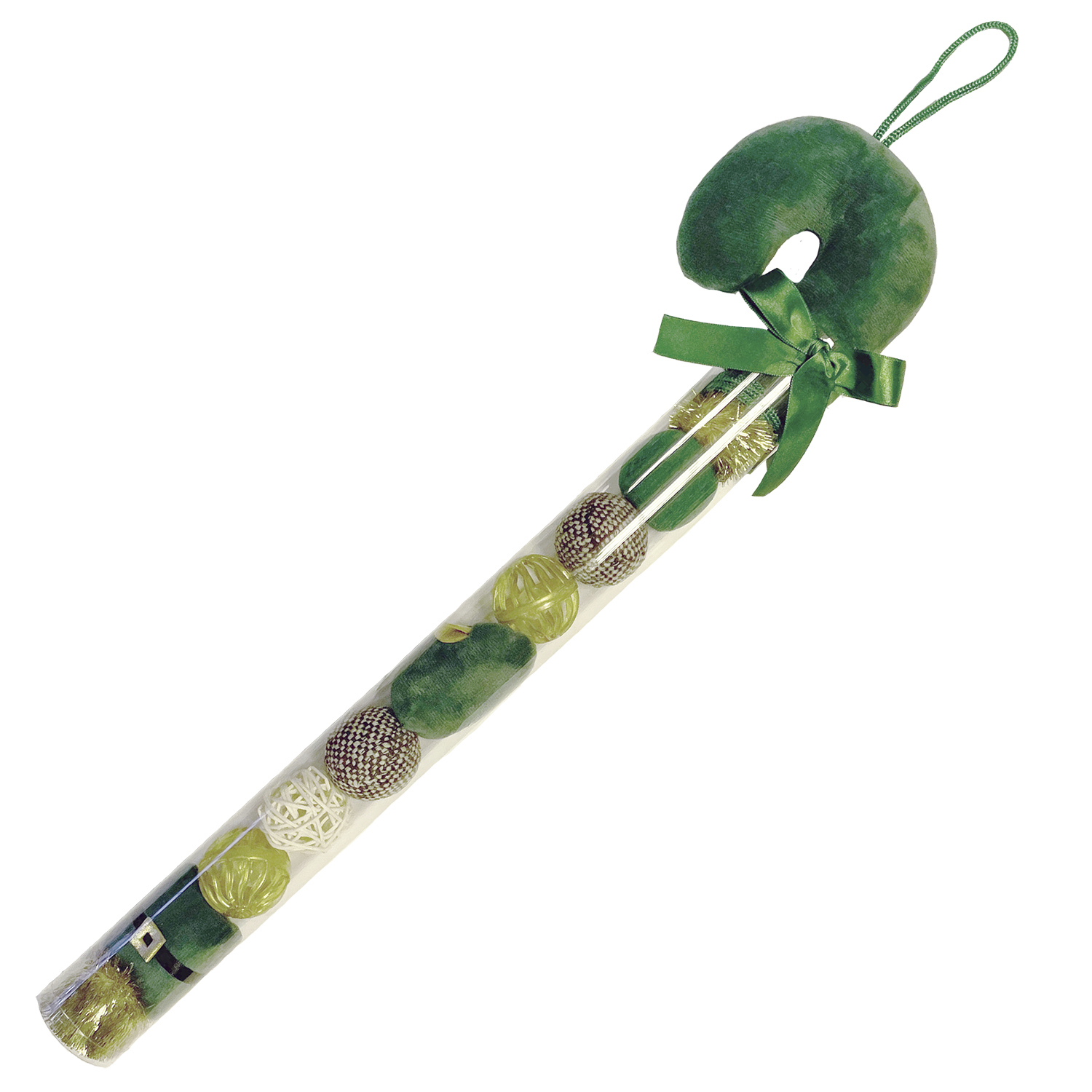 Tämä jouluinen lahjakeppi sisältää kaikkiaan 11 erilaista lelua. Kangas leluissa on mukana myös kissanminttua ja pallot ovat kaikki erilaisia ja pitävät erilaisia ääniä.