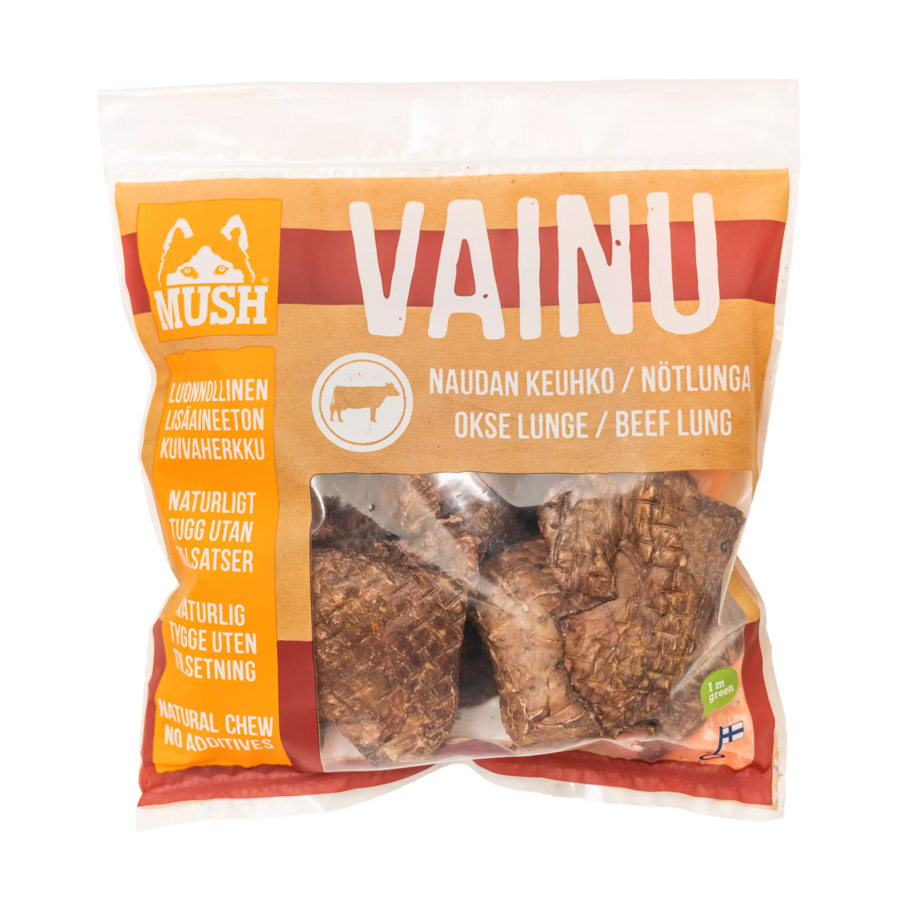Mush Vainu Naudankeuhko on kevyt kuljettaa mukana pidemmillekkin matkoille. Keuhkopalat ovat mukavan huokoisia rakenteeltaan ja sopivat siksi erinomaisesti myös seniorikoirien herkkupaloiksi. Hienonnetut Vainu keuhkopalat sopivat hyvin myös koiranpennuille ja kissoille.