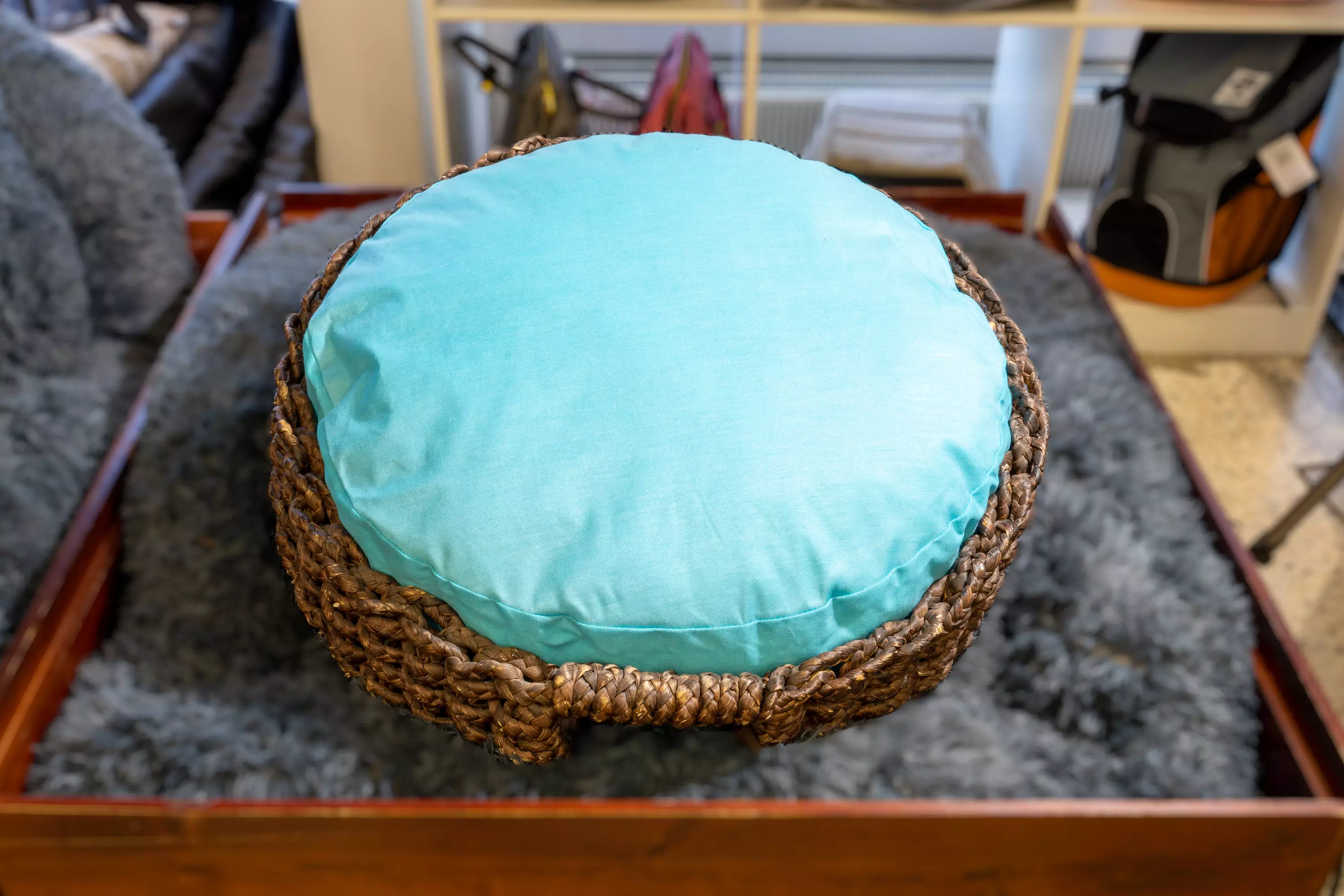 Ihastuttava pyöreän muotoinen koripeti vaaleansinisellä tyynyllä. Peti on halkaisijaltaan 56cm. Tyynyssä on irrotettava päällinen ja se voidaan pestä 30 asteessa.
