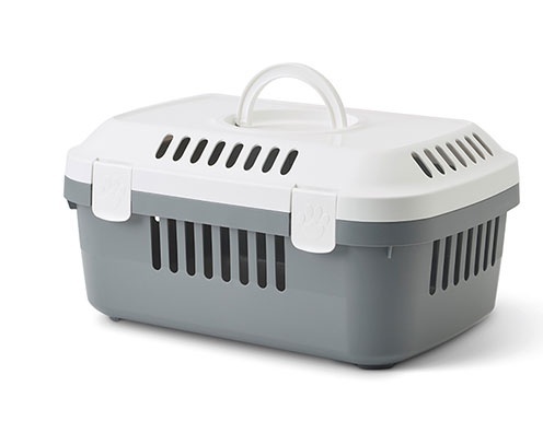Muovinen kuljetusboksi pieneläimille, max. 5 kg. Kantokahva, päältä avautuva kansi. Koko 33X48,5X31,5cm, alaosan väri harmaa, yläosa valkoinen.