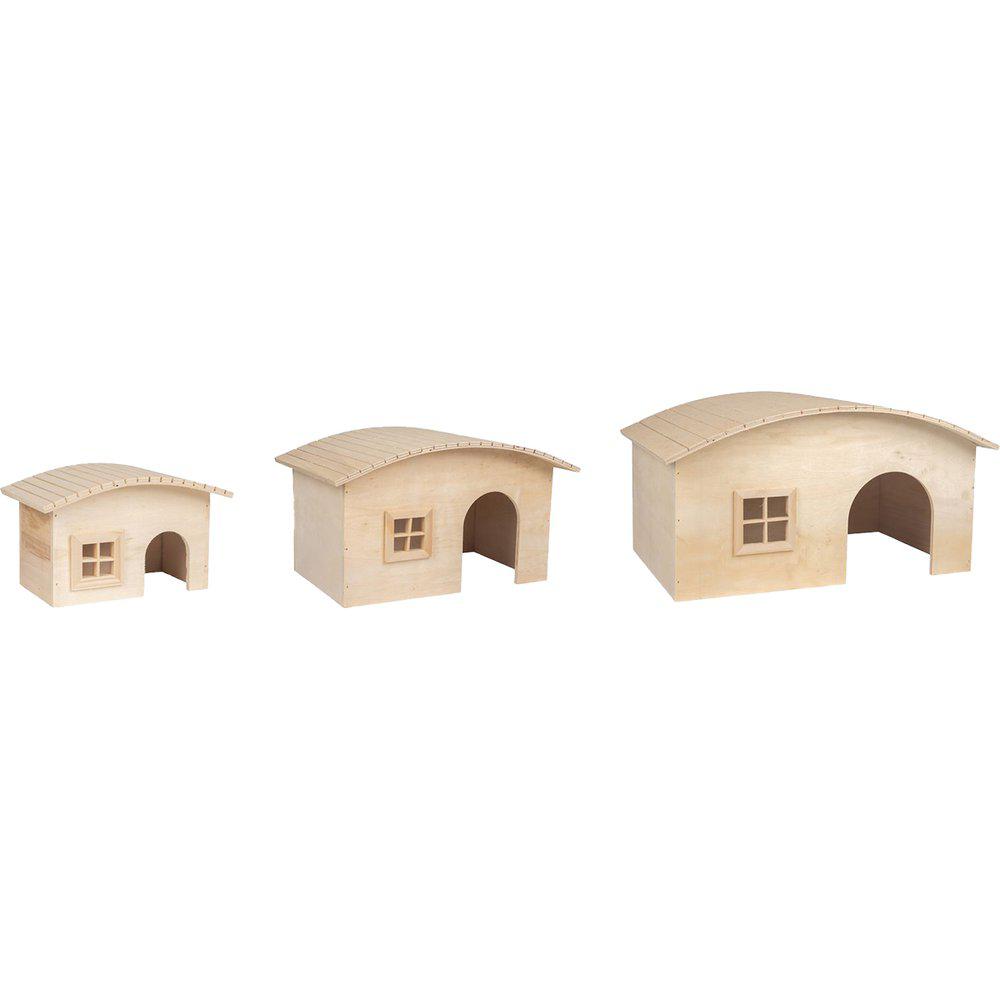 Upea, esteettinen puinen pesämökki jyrsijöille. Kaareva katto tuo hienon yksityiskohdan mökkiin suloisen ikkuna-aukon lisäksi!
