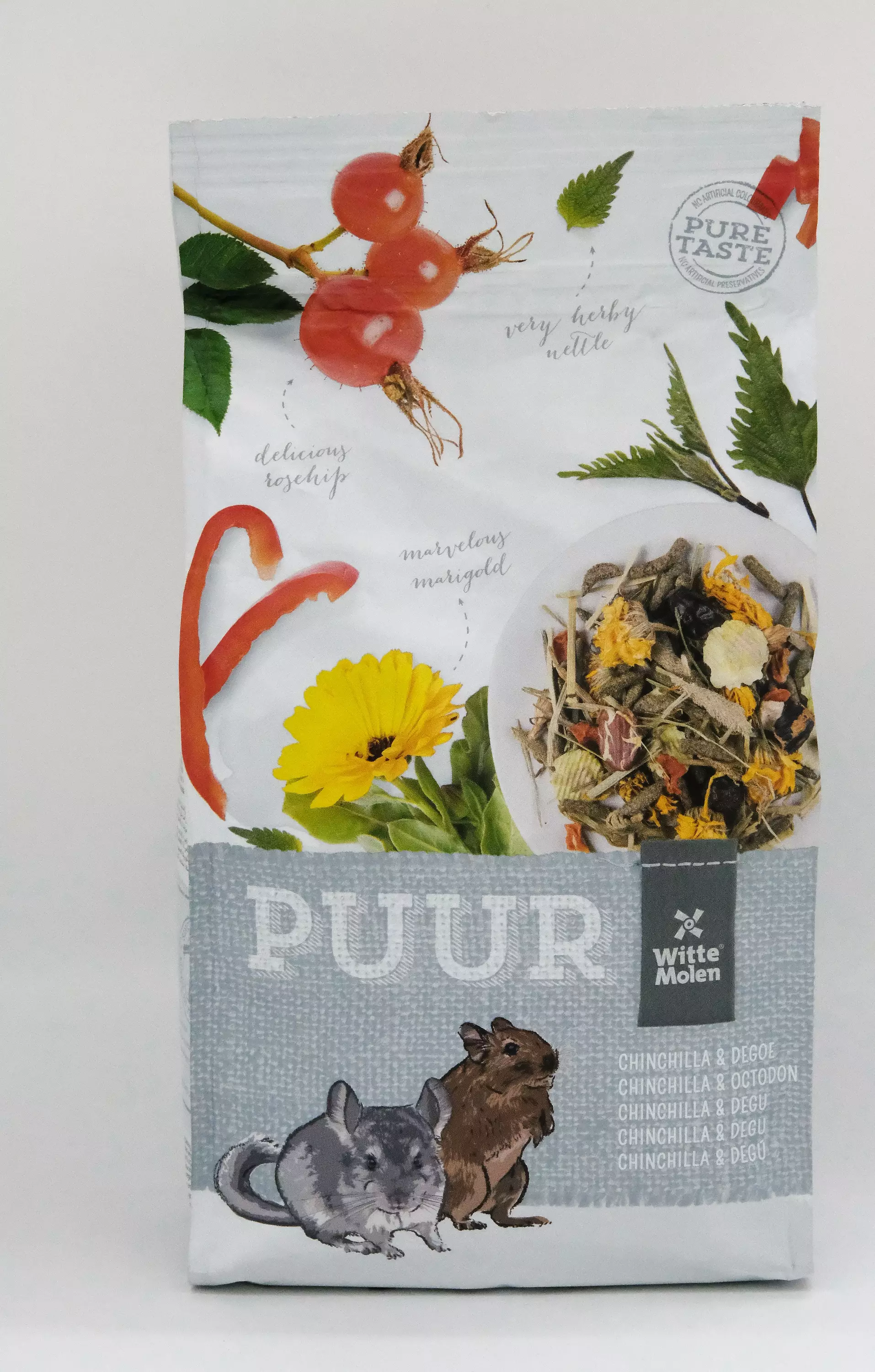 Witte Molen PUUR Chinchilla & Degu on chinchilloille ja deguille suunniteltu ruoka, joka vastaa näiden ravintovaatimuksiltaan haasteellisten jyrsijöiden ravinnontarpeisiin. Runsaasti kuituja ja vähän tärkkelystä sisältävä täysravinto noudattaa chinchillan ja degun luonnollista ruokavaliota. Ruokaan ei ole lisätty sokeria ja ruoan luonnollinen koostumus auttaa ylläpitämään chincillan ja degun sokeritonta ruokavaliota.