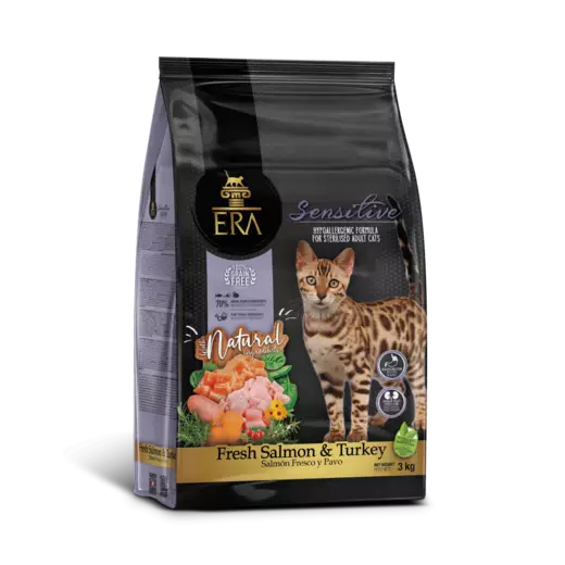 ERA Grain-Free STERILISED SENSITIVE ADULT – Fresh Salmon & Turkey on lohta ja kalkkunaa sisälytävä täysravinto kaikenrotuisille aikuisille kissoille.