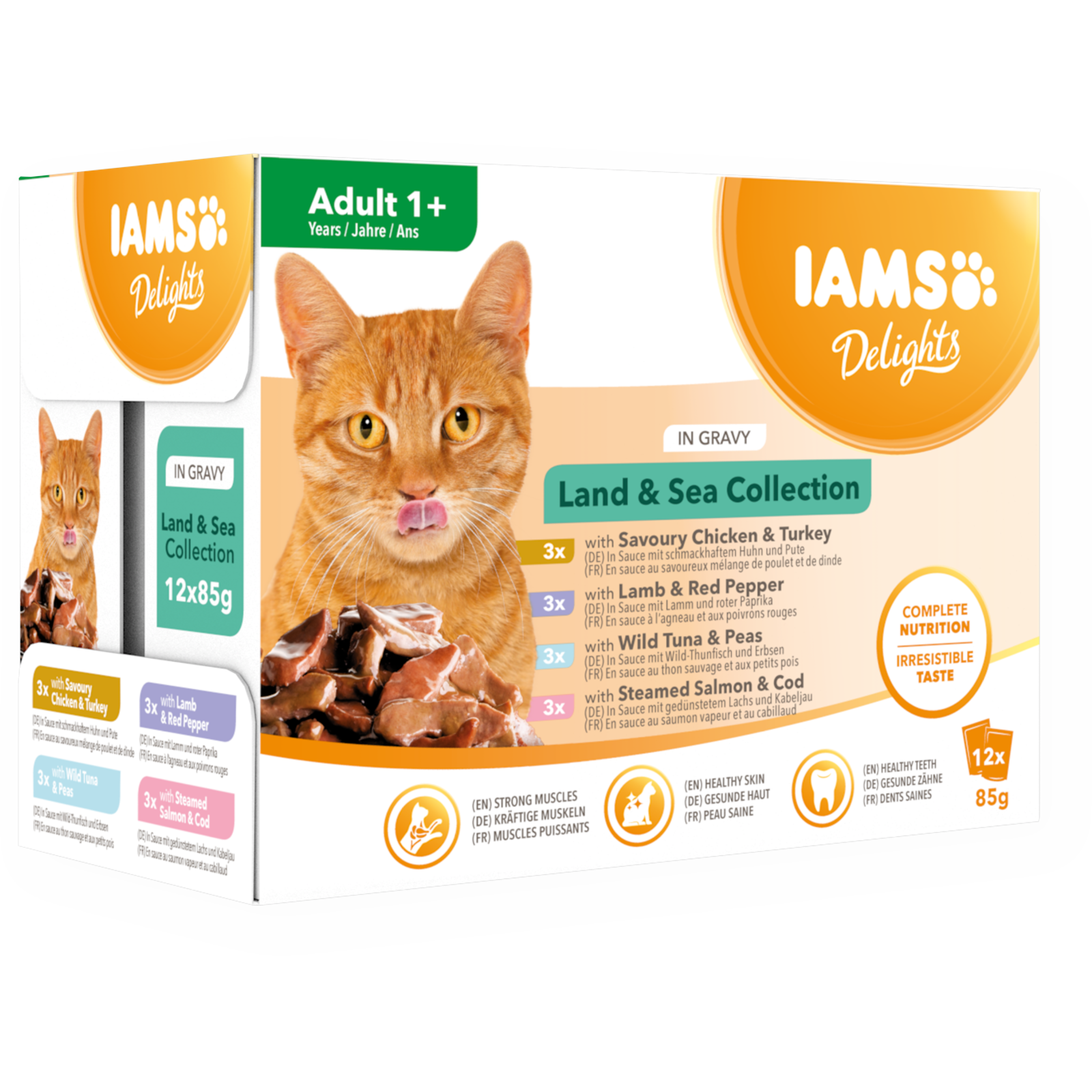 IAMS Delights -sarjan liha- ja kalalajitelma kastikkeessa -ravinto on täydellistä ja tasapainoista märkäruokaa aikuisille kissoille kätevässä monipakkauksessa. Liha- ja kalalajitelma kastikkeessa sisältää neljä herkullista ruokaa, joihin kissasi ihastuu.
