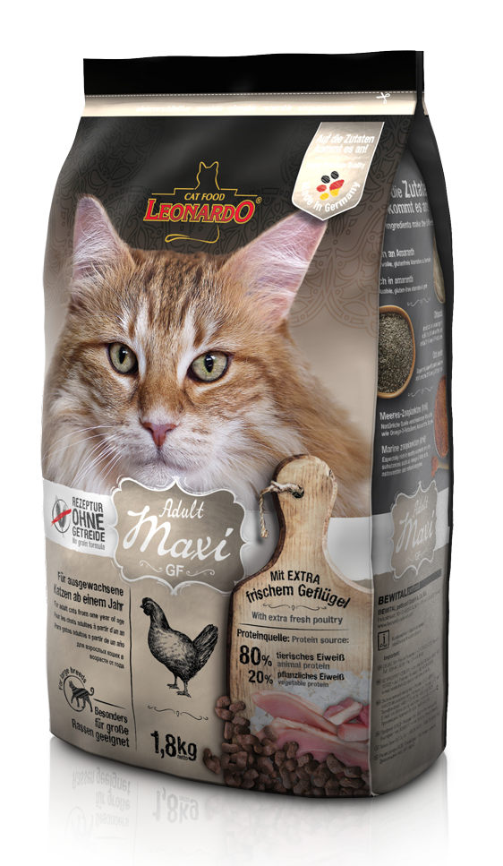 Leonardo Adult Maxi GF - isoille ja miksei pienimmillekin kissoille. Erityinen iso nappulan muoto, pidentää pureskeluaikaa. Tuore siipikarjanliha (30 %); Siipikarjaproteiini, vähätuhkainen... Lue lisää