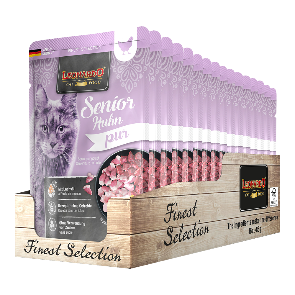 Leonardo Senior Chicken pure erinomainen vaihtoehto jo asettuneille vähemmän seikkailunhaluisille vanhemmille kissoille. Tai heille joiden olisi hyvä vähän tarkkailla linjojaan. Yksi hyvin sulava proteiininlähde ja lisätty lohiöljy turkin hyvinvointiin.
