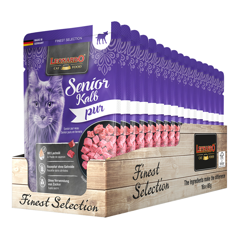 Leonardo Senior Veal pure täyttää ikääntyvien kissojen erityiset tarpeet. Yksi hyvin sulava proteiininlähde ja lisätty lohiöljy turkin hyvinvointiin.