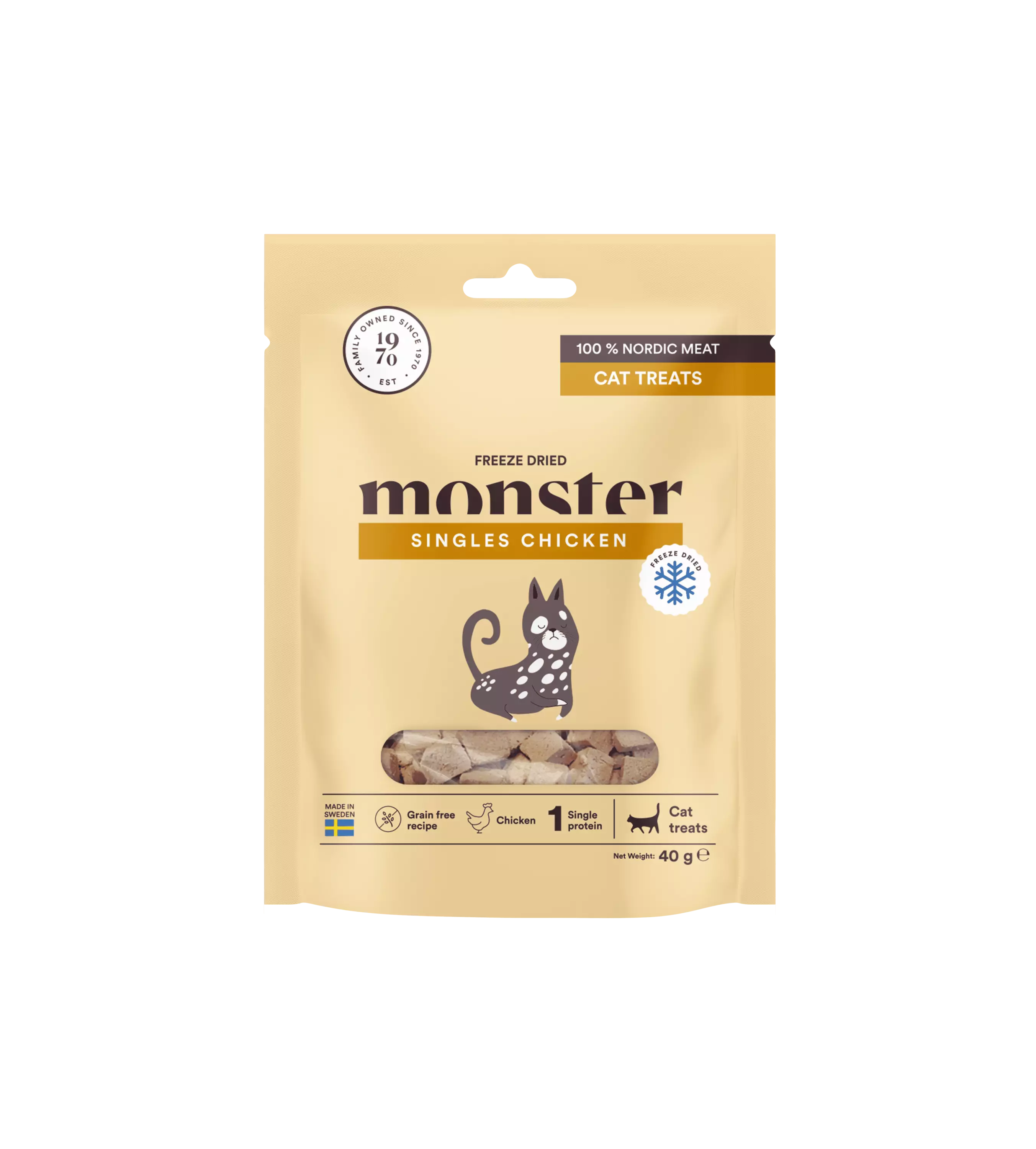 100 prosenttisesti pelkkää pakastekuivattua kanaa - parasta kissallesi! Monster-herkut on terveellinen ja maistuva lihaherkku, jotka sisältävät vain yhtä proteiinia.