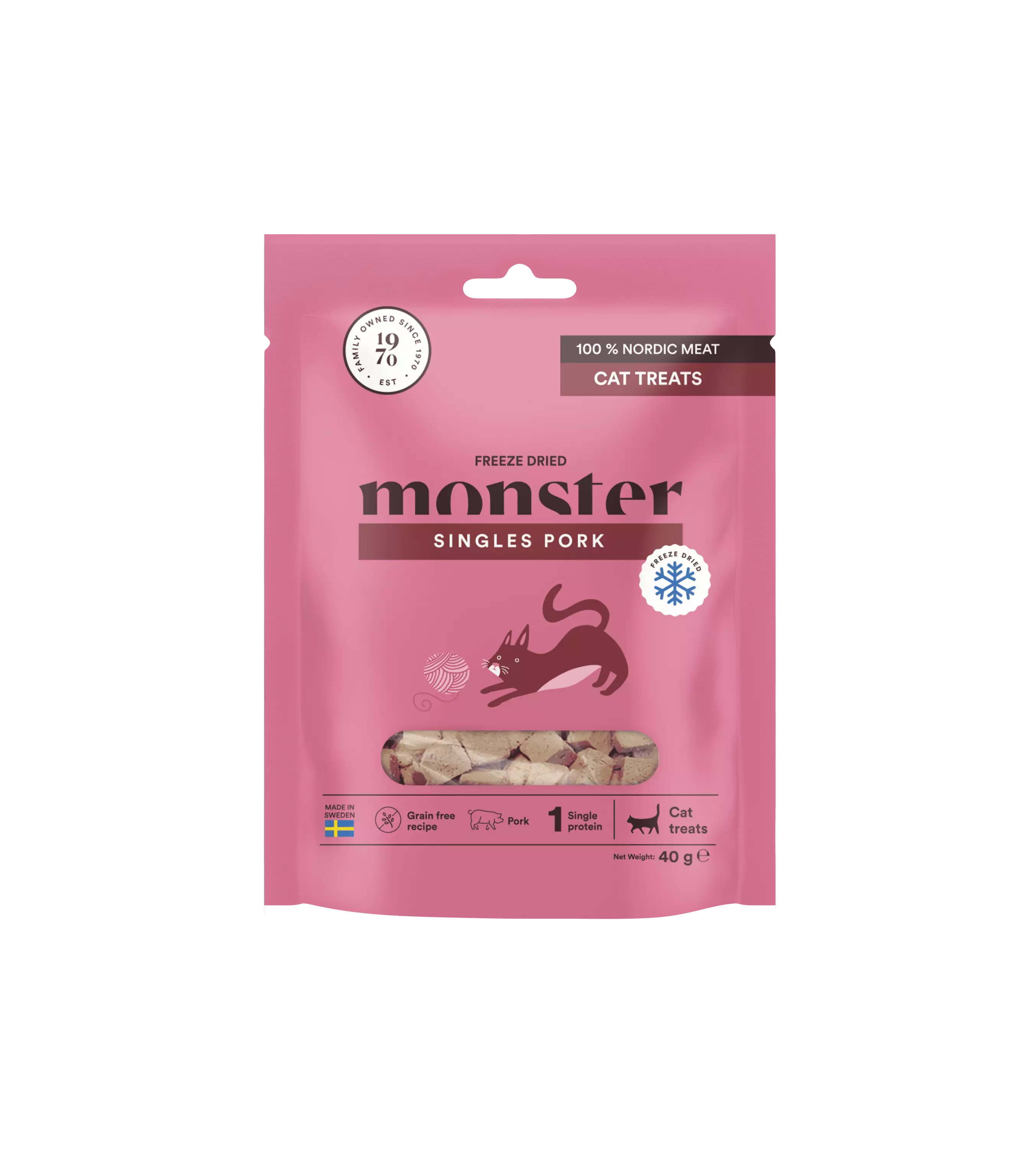 100 prosenttisesti pelkkää pakastekuivattua possua - parasta kissallesi! Monster-herkut on terveellinen ja maistuva lihaherkku, jotka sisältävät vain yhtä proteiinia.