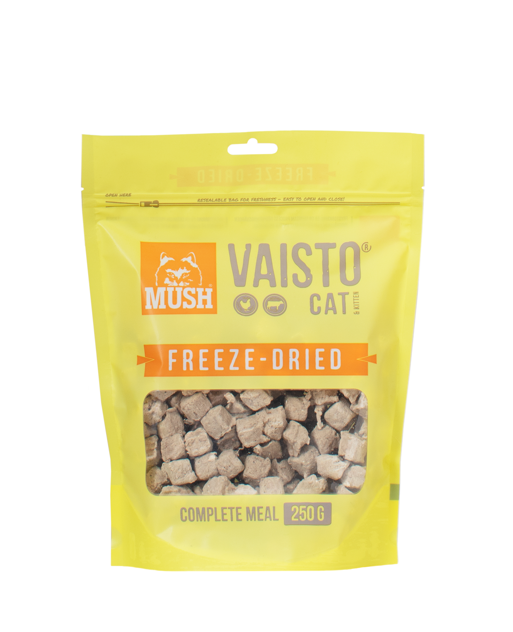 MUSH Vaisto Cat Keltainen Freeze-Dried (kana-nauta) on pakastekuivattu täysravinto kaikenikäisille kissoille. Tuote sisältää pennuille tärkeitä ravintoaineita, esim. D-vitamiinia, kuparia, sekä jodia ja on siksi erinomainen vaihtoehto myös pennuille.