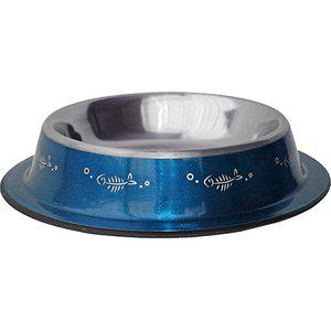 Ruostumatonta terästä oleva pieni ruokakuppi, pohjassa anti-slip reunat ja kyljissä kauniit kalanruotokuviot.