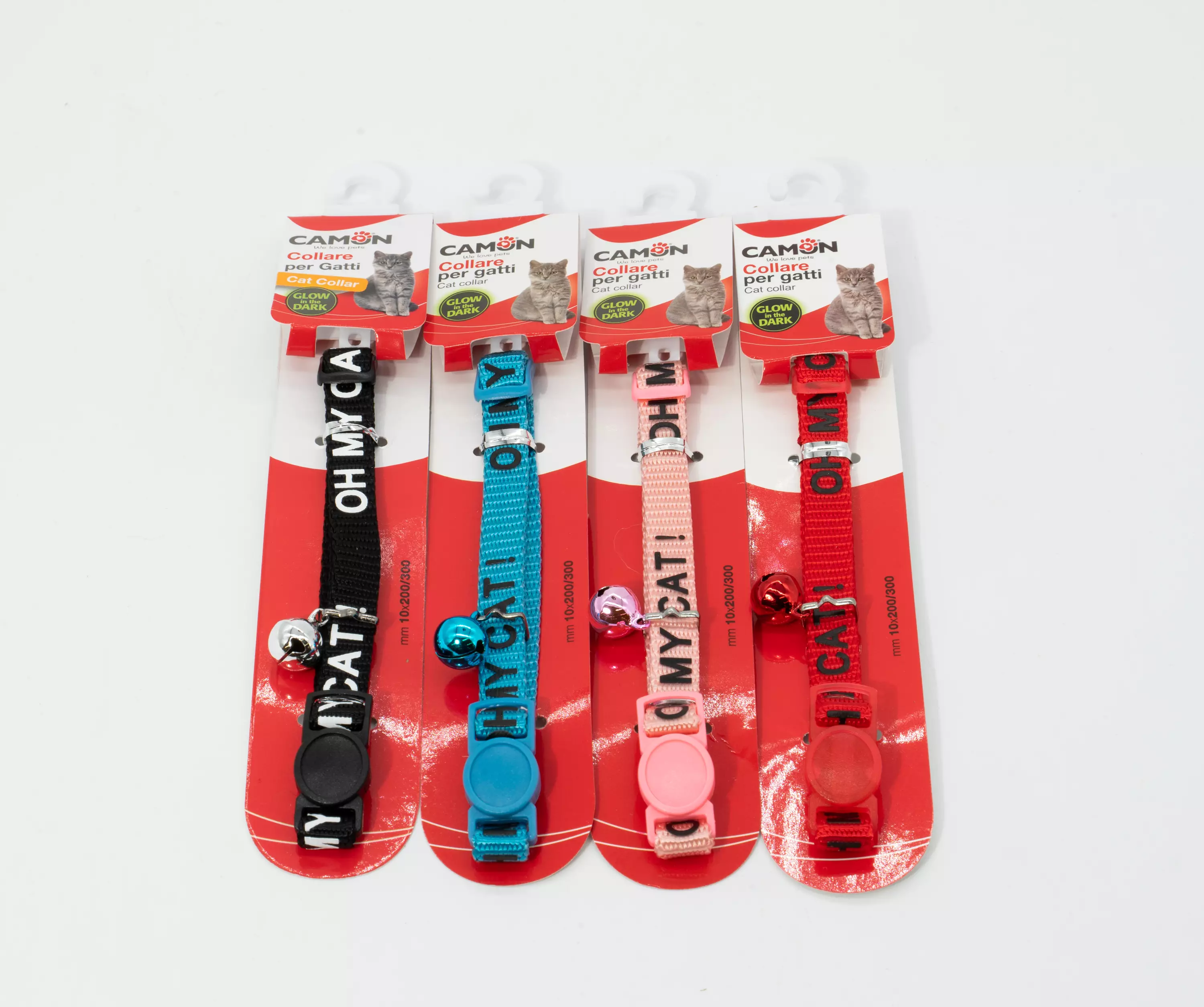 Pimeässä hohtava säädettävä kaulapanta kissoille. Pannassa on kulkunen ja turvalukko eli lukko aukeaa vetämällä. Pannassa on teksti "OH MY CAT!"