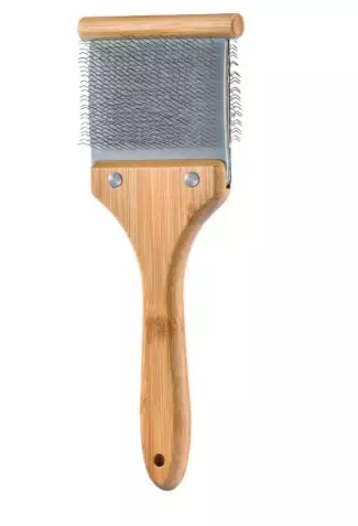 Harmaa puoli ohuemmilla piikkeillä ja satunnaisella sijoittelulla sopii ihanteellisesti karvan suoristamiseen ja turkin avaamiseen, musta puoli tiheämmillä rivissä olevilla piikeillä sopii erityisesti takkujen aukaisuun. Piikit 18mm.