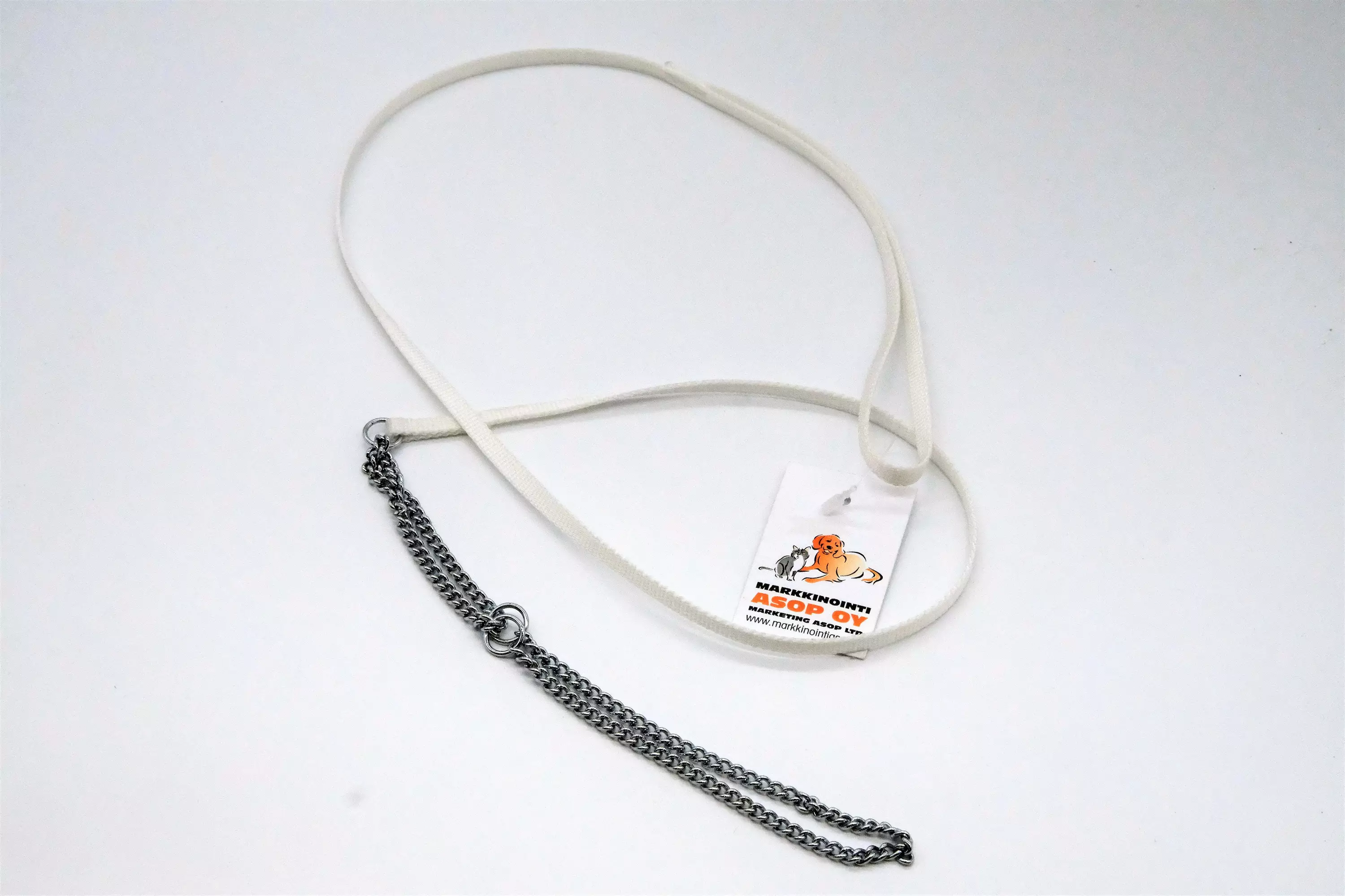 Kevyt valkoinen näyttelytalutin johon on yhdistetty musta puolikuristava panta. Puolikuristava osa pienimmillään on 20cm ja suurimmilla 26cm. Verkkokauppa Kouvolasta sinun lemmikkiäsi varten... Lue lisää