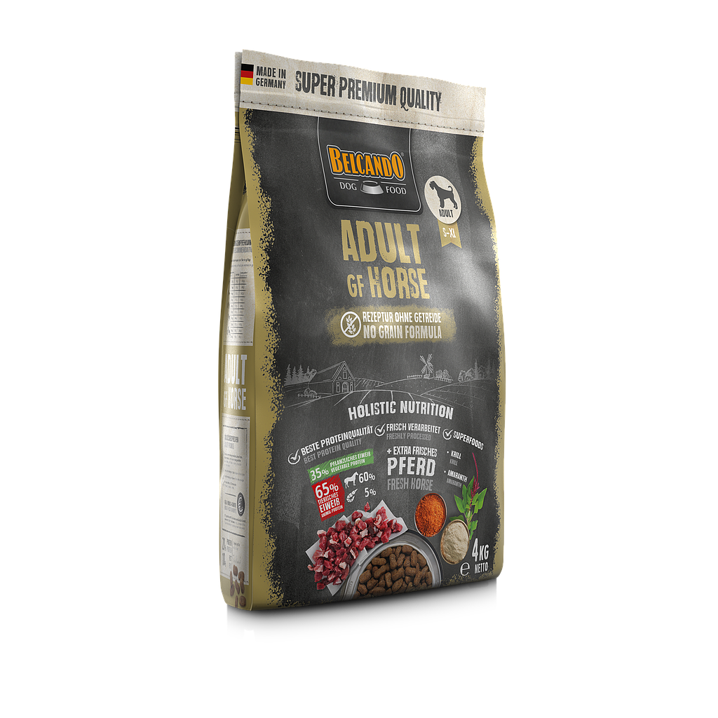 Korkealaatuinen koiranruoka viljaherkille ja normaaliaktiivisille koirille. Eläinproteiinin osuus kokonaisproteiinista 65% (hevonen 60%, kala/krilli 5%)