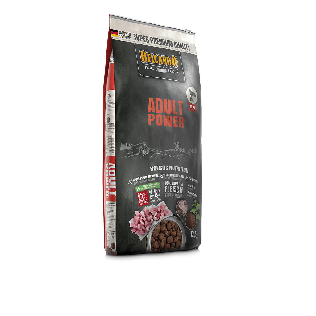 Huolellisesti valitut raaka-aineet, paljon helposti sulavaa siipikarjaa ja kalaa korkean biologisen arvon omaavana valkuaislähteenä. Erityisesti kalasta saadut omega-3 rasvahapot tekevät Belcando Adult Powerista optimaalisen ruoan koirille jotka tarvitsevat paljon energiaa. Kylmäpuristetut viinirypäleensiemenet varmistavat optimaalisen solusuojan. Erityisesti korkea proteiini- ja rasvataso takaa riittävän energiansaannin myös työ- ja urheilukoirilla. Korkea ravintosisältö on tarpeellinen myös kantaville ja imettäville nartuille