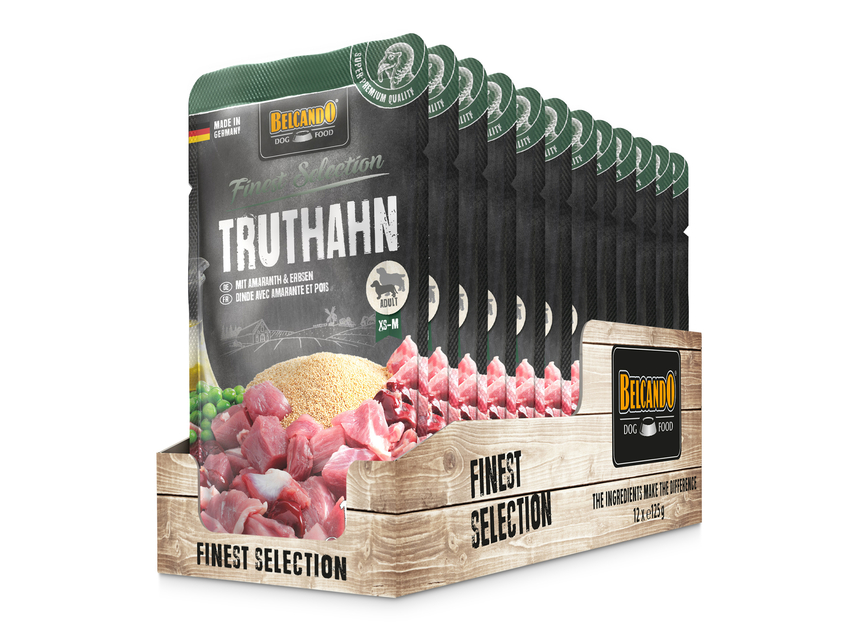 Koostumus:Kalkkunanliha, sydän, maksa, kivipiira (63 %); kalkkunanlihaliemi (26,5 %); keitetty amarantti (5 %); herne (4 %); ohdakeöljy (0,5 %); kuivatut munankuoret (0,5 %); mineraalit (0,5 %)