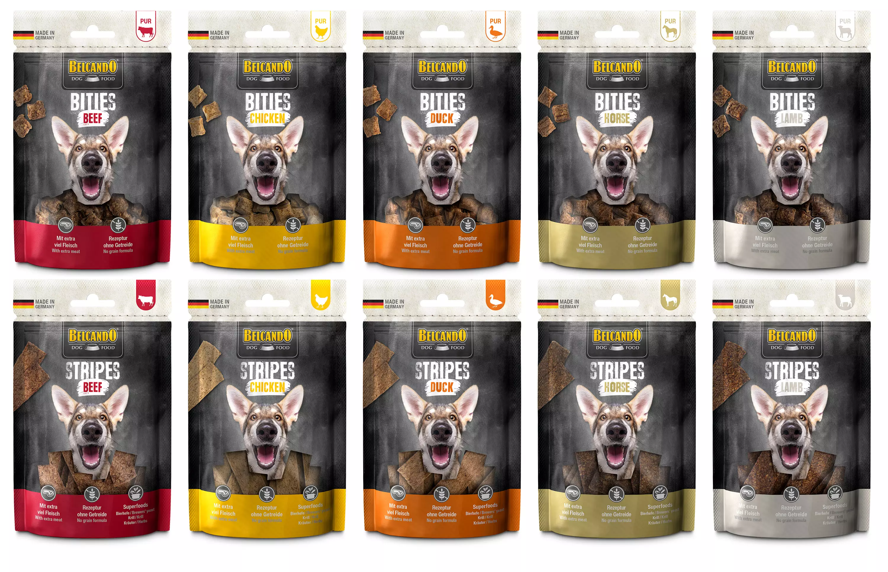Belcando Stripes, vastustamattoman herkullista lihaa ja terveellisiä superfoodeja (krilli, yriti ja panimohiiva). Erittäin lihaiset Stripes herkut on luonnollisesti "Made in Germany". Viljaton ja sokeriton resepti on hellävaraisesti ilmakuivattu.