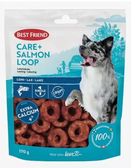 Best Friend Care+ Salmon Loop lohirinkula on hauska, herkullinen ja rapea koiran herkku kaikille koirille. Pieni donitsin muotoinen makupala sopii täydellisesti päivittäiseen hemmotteluun ja... Lue lisää