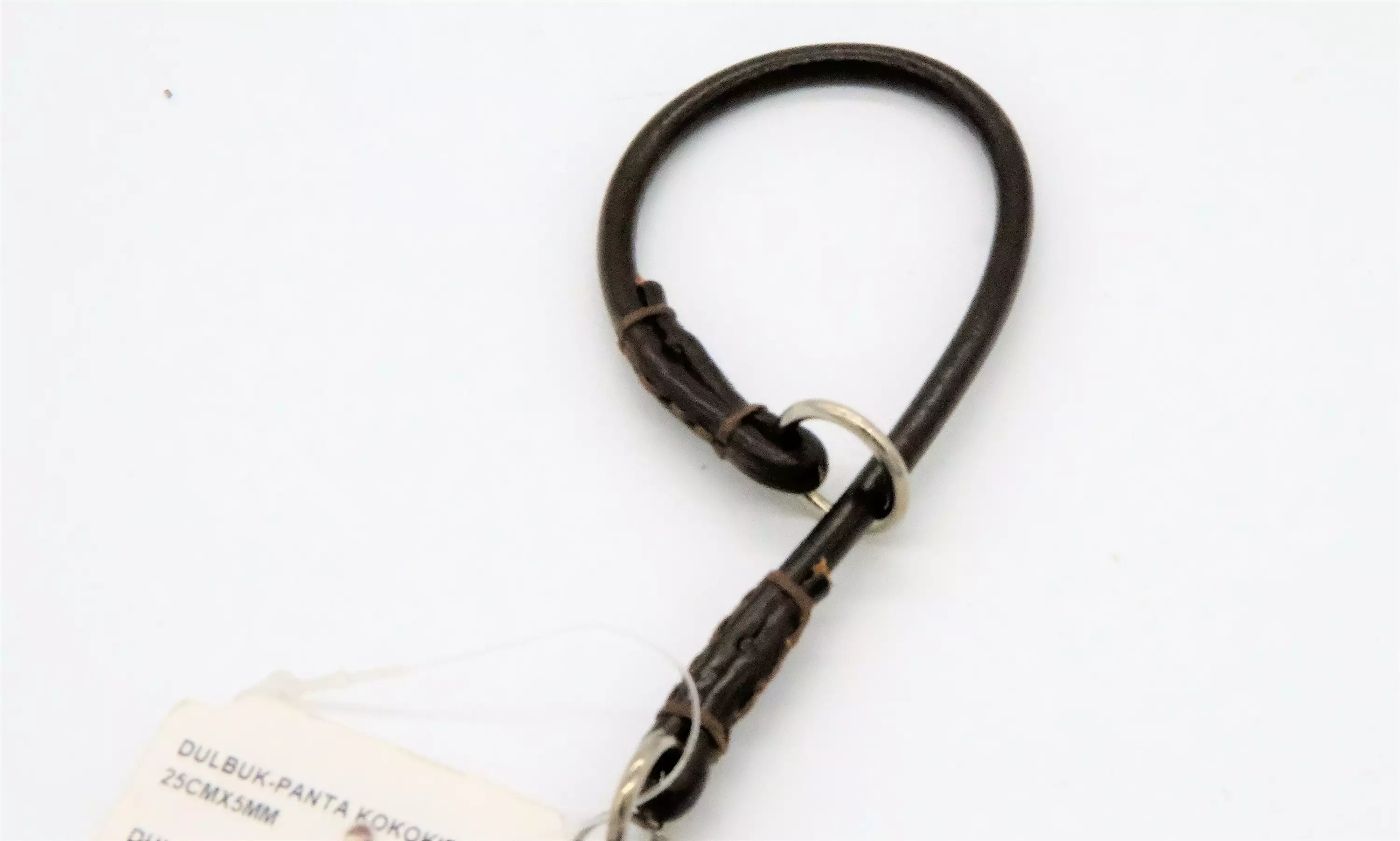 Pyöreästä konenahkasta tehty kokokuristava panta esimerkiksi näyttelyihin. Panta on pieni ja kevyt ja huomaamaton.