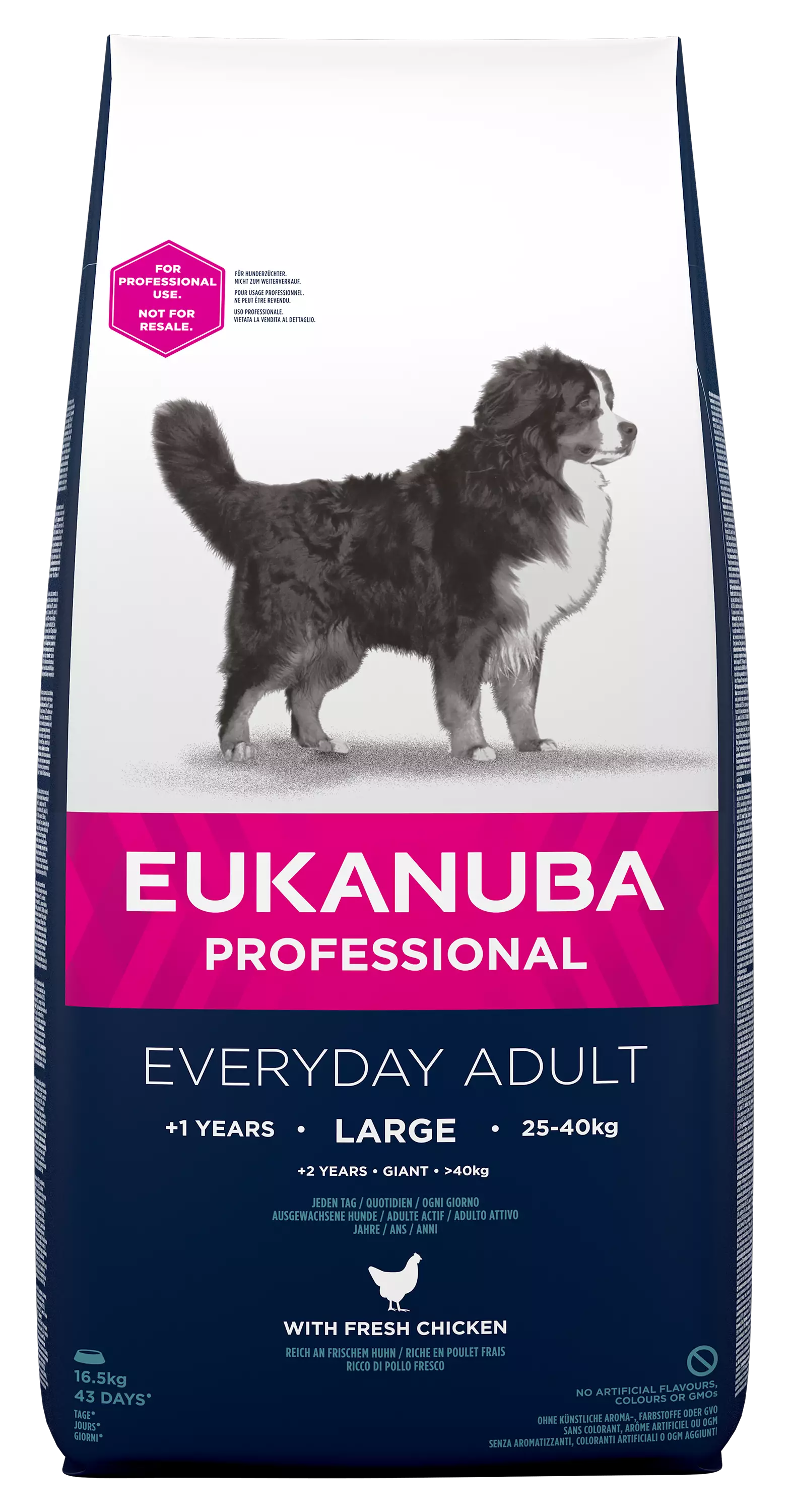 Eukanuban aikuisen koiran kuivaruoka suurille roduille sisältää laadukasta eläinproteiinia (tärkeimpänä ainesosana kanaa), rasvaa, hiilihydraatteja, kuitua sekä tärkeitä vitamiineja ja mineraaleja suurten ja jättikokoisten aikuisten koirien terveyden ja hyvinvoinnin tueksi. Tämä koiranruoka on kehitetty yhteistyössä eläinlääkärien kanssa, ja se on huippukasvattajien suosittelema, ja se tarjoaa koirallesi 100-prosenttisen täydellistä ja tasapainoista ravintoa.