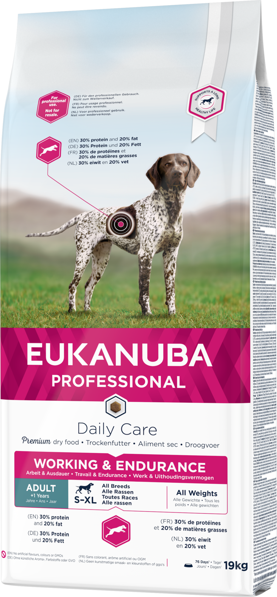 EUKANUBA Daily Care aktiivisille työkoirille, jotka tarvitsevat paljon energiaa ja ravintoaineita ollakseen kestäviä ja pystyäkseen toimimaan parhaalla mahdollisella tavalla. Suuri proteiinin (30%) ja rasvan (20%) määrä parantavat runsaasti liikkuvien ja työskentelevien koirien kestävyyttä, ja omega-3 ja omega-6 tukevat hajuaistia. Tätä ravintoa suositellaan myös tiineille ja imettäville nartuille. Nappuloiden erityinen kuusikulmainen muoto ja ainutlaatuinen DentaDefense-teknologia auttavat pitämään hampaat puhtaina ja terveinä. EUKANUBA Daily Care -kuivaruoka työkoirille sisältää tuoretta kanaa kiinteiden lihasten tueksi. Täydellinen ja tasapainoinen ruoka kaikkien rotujen aikuisille koirille.