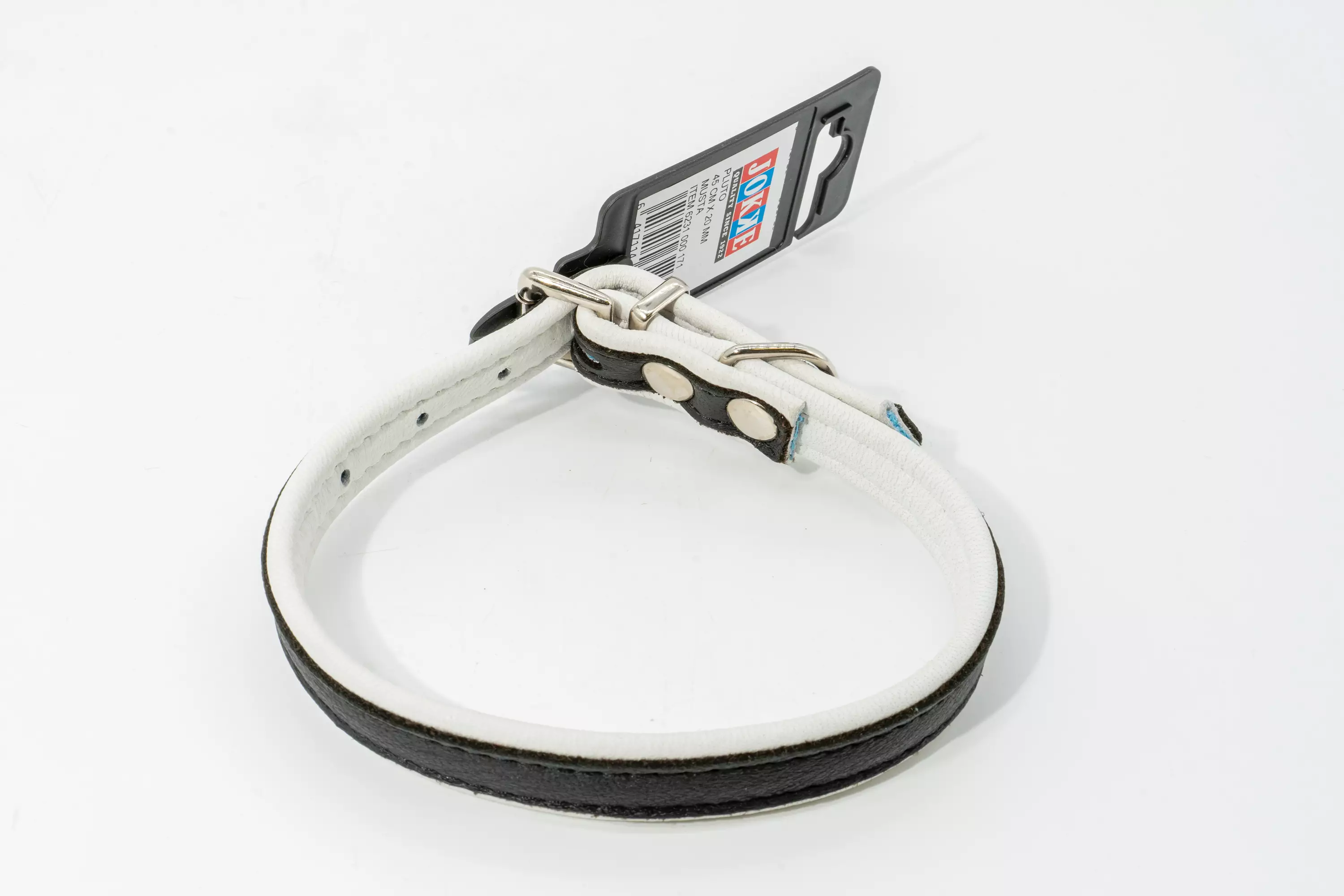 Nahkainen koiran kaulapanta. Nahka on mukavan pehmeä ja taipuisa! Väriltään panta on mustavalkoinen.