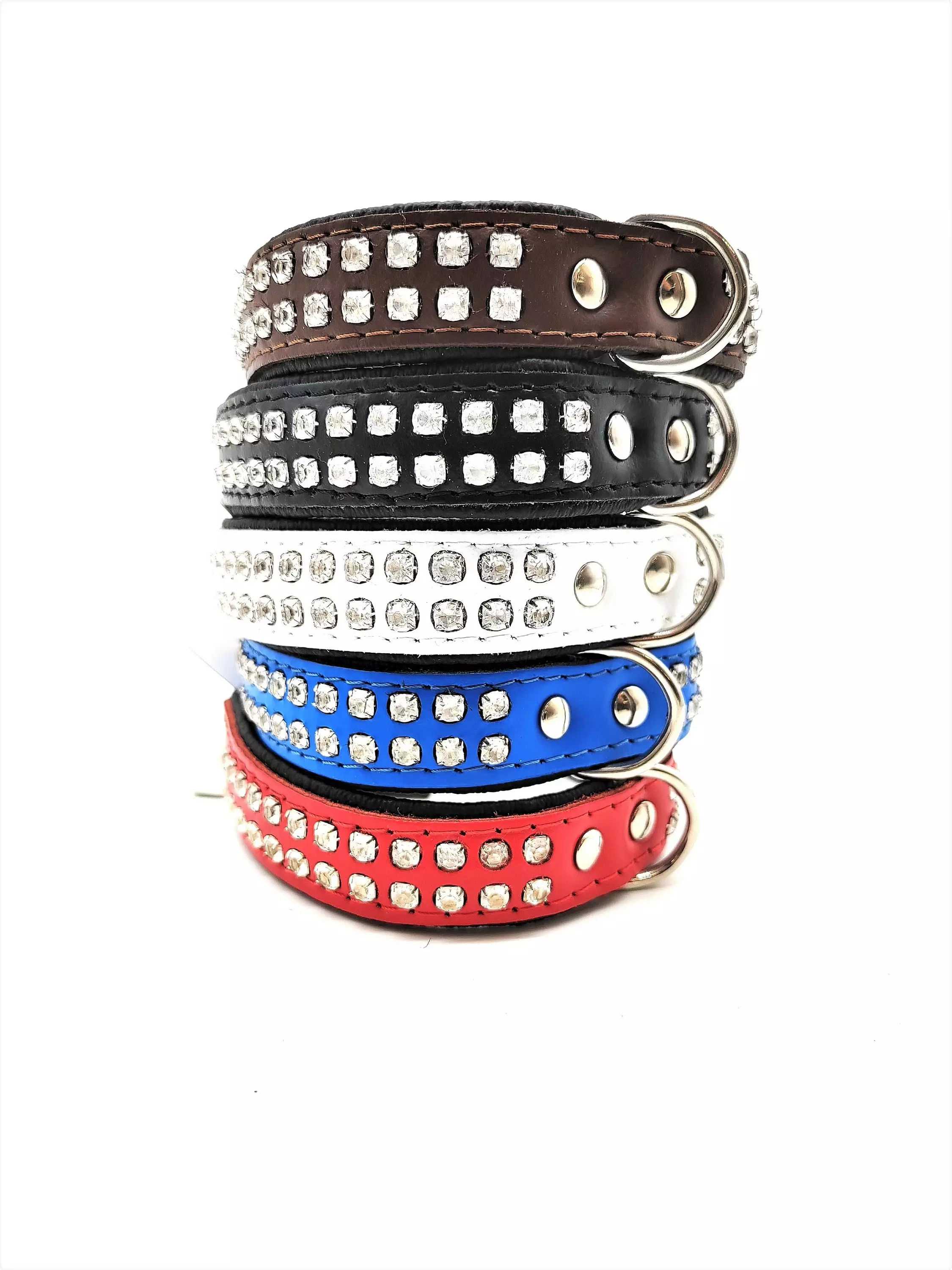 Nahkainen solkipanta timanteilla. Pannan pituus 35cm ja leveys 20mm.