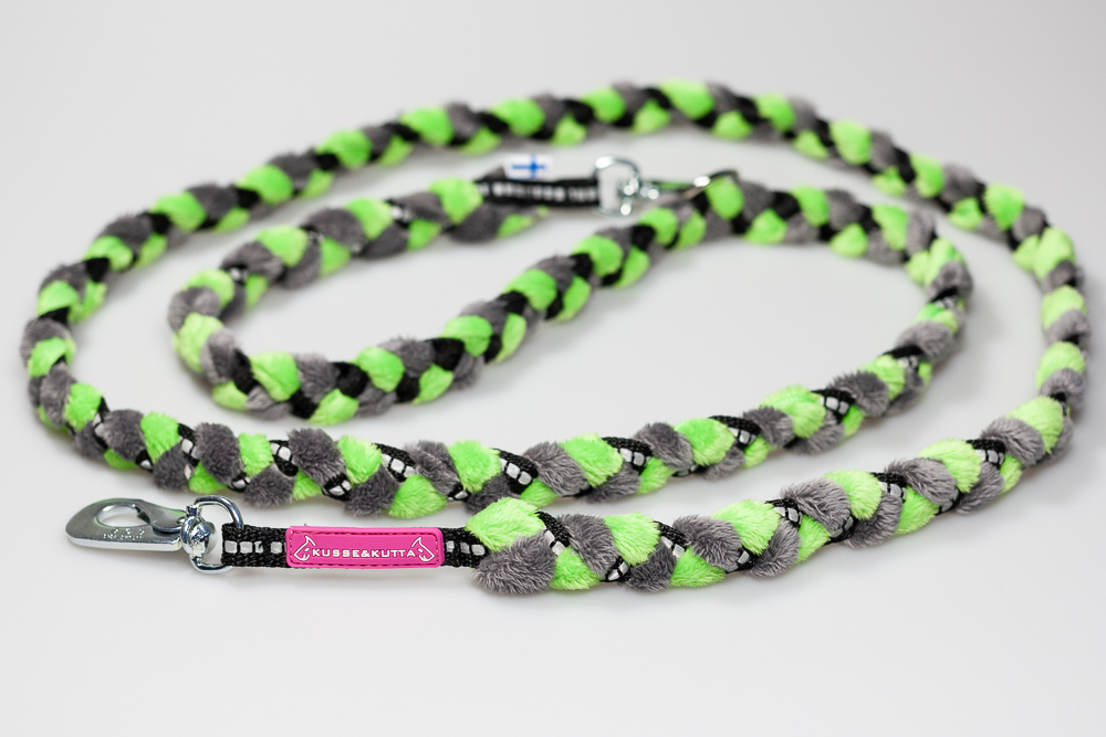 Hihnan kokonaispituus on 180cm ja leveys noin 1cm. Hihnaan on punottu pehmoista ja karvaista tekokuitua sekä heijastava hihna näkyvyyden lisäämiseksi!