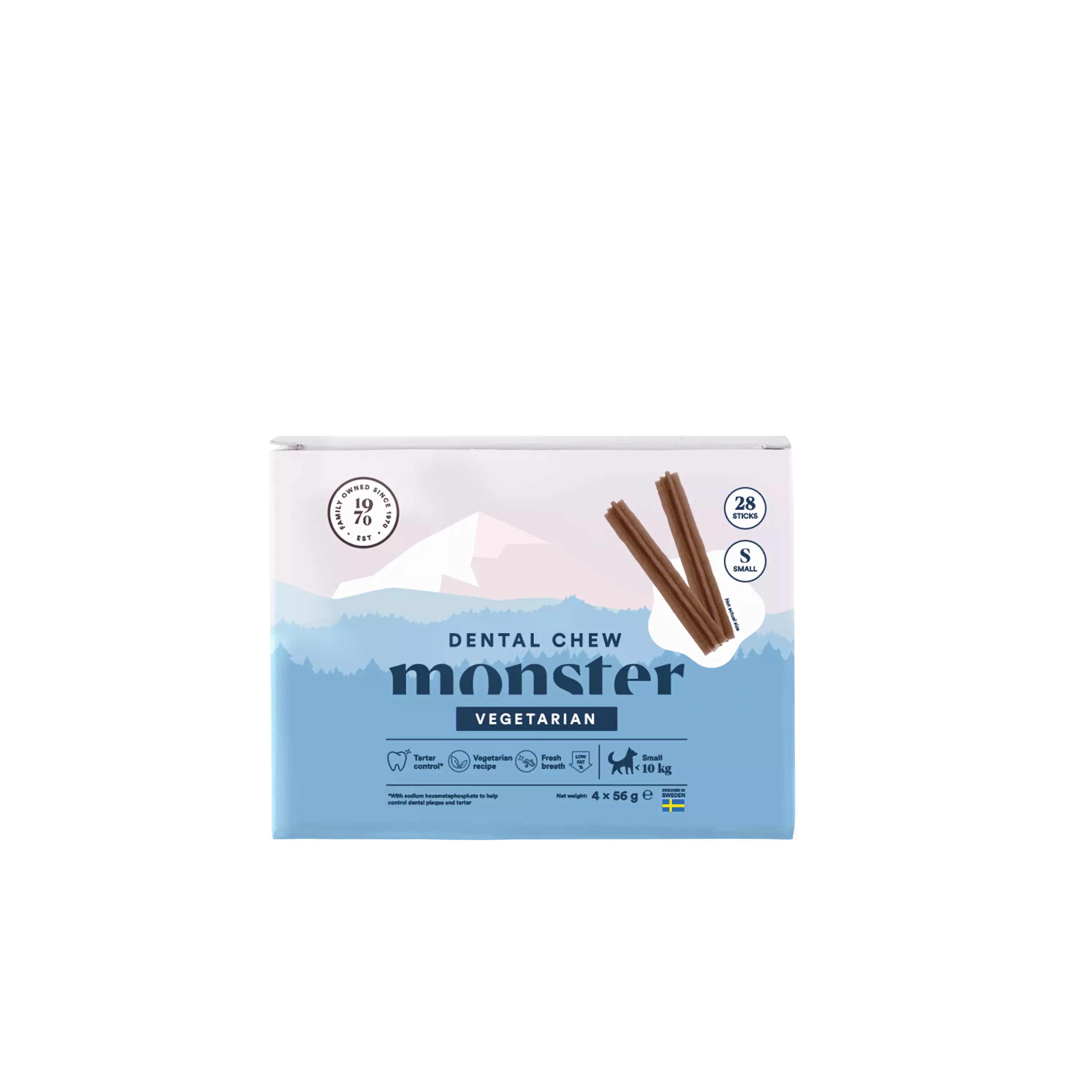 Kasvispohjainen, vähärasvainen Dental - purutikku Monsterilta! Auttaa kontrolloimaan plakin muodostumista ja raikastaa hengitystä.
