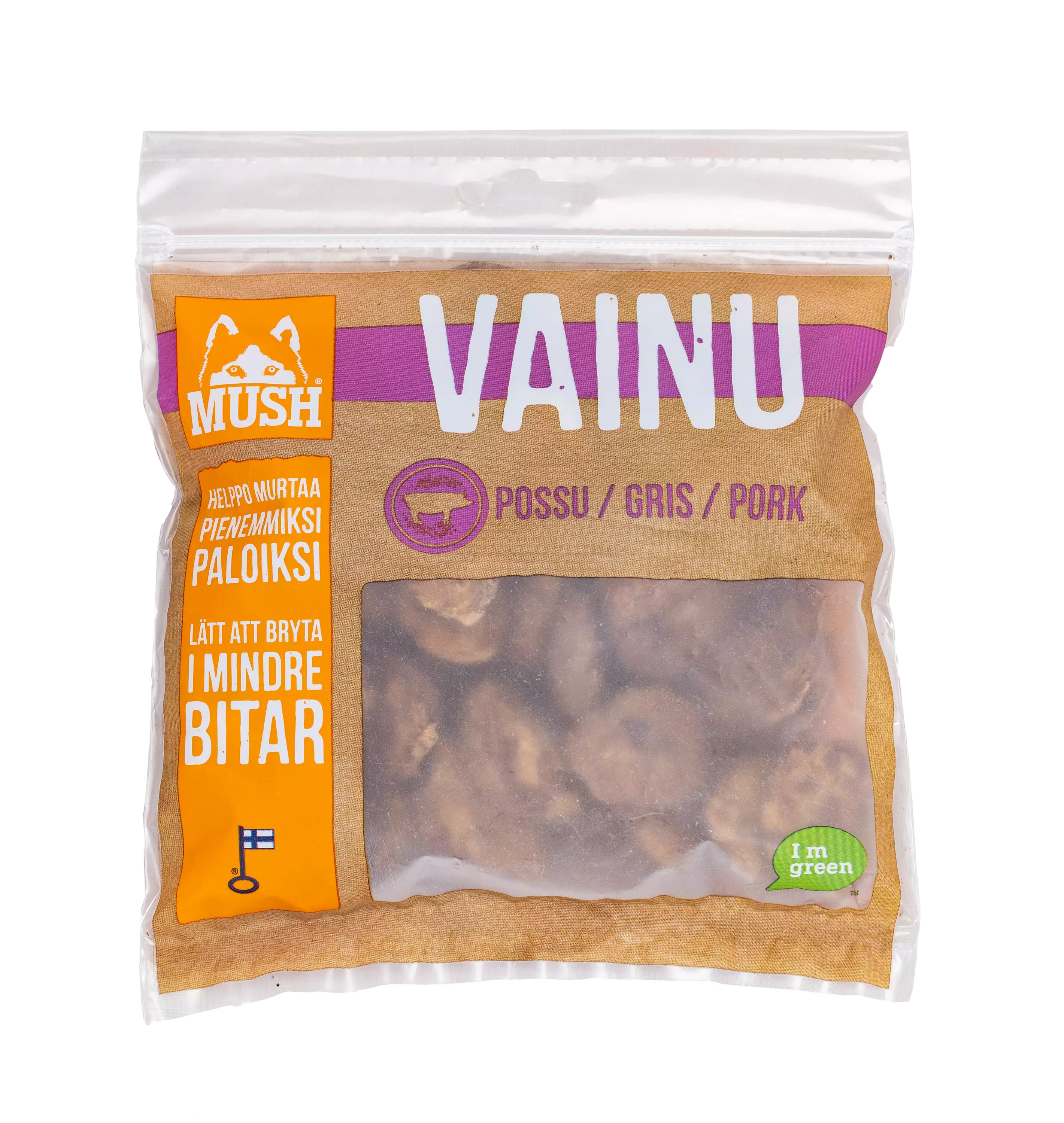 Mush Vainu Possunami on muotoiltu Kananamin tavoin käteviksi, pieniksi kiekoiksi, jotka saa helposti murrettua pienemmiksi paloiksi. Possunami sopii koirille ja kissoille herkkuhetkiin... Lue lisää