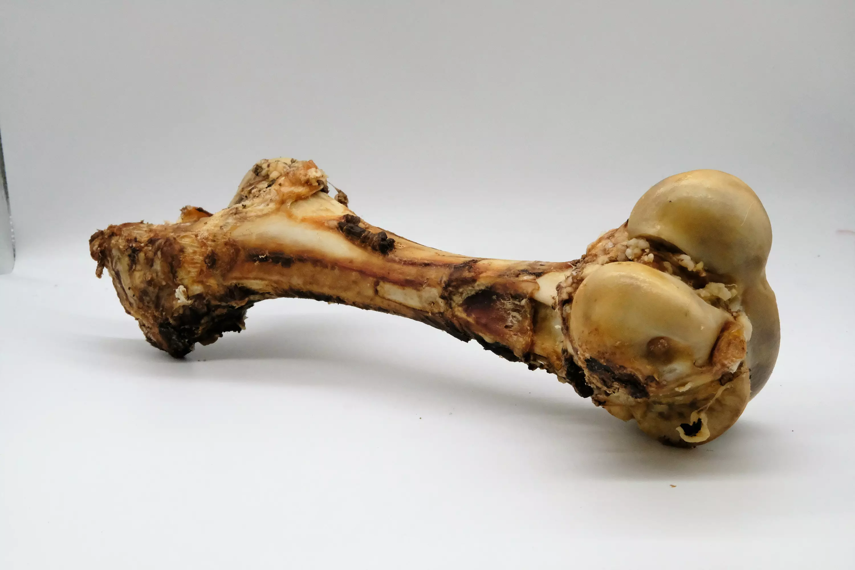 Se isoin vaihtoehto! Kotimainen paistettu luu ytimineen ja lumpioineen. Naudan kokonainen reisiluu on kova ja erityisen pitkäkestoinen ajanvieteluu. Lähes puolimetrinen (pituus n. 40–45 cm) jättiluu tarjoaa tekemistä ja hammashuoltoa suuremmillekin koirakavereille! Valvothan koiraa aina sen syödessä luuta sisältäviä tuotteita.