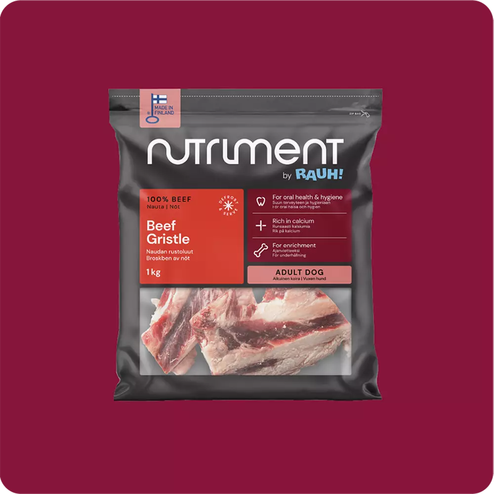 Nutriment by RAUH raakapakasteet on puhtaista raaka-aineista valmistettua raakaruokaa ilman säilöntäaineita. Rustoluut ovat niveliä ja putkiluita pehmeämpiä, kokonaan syötäviä raakaluita.