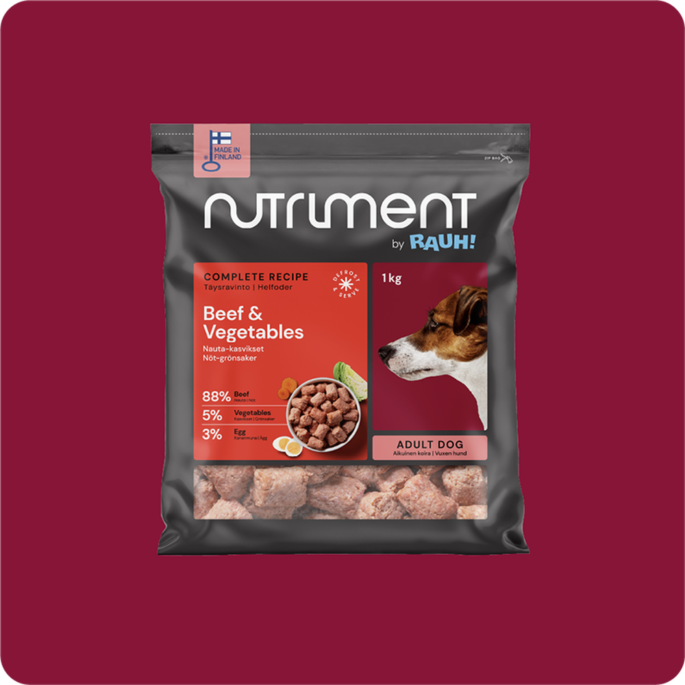 Nutriment by RAUH raakapakasteet on puhtaista raaka-aineista valmistettua raakaruokaa ilman säilöntäaineita. Nauta-kasvispullat ovat oiva vaihtoehto koirasi täysravinnoksi. Se sisältää kaikki tarvittavat vitamiinit ja hivenaineet tarkkaan suunnitellulla reseptillä, ammattilaisten laskemassa suhteessa.