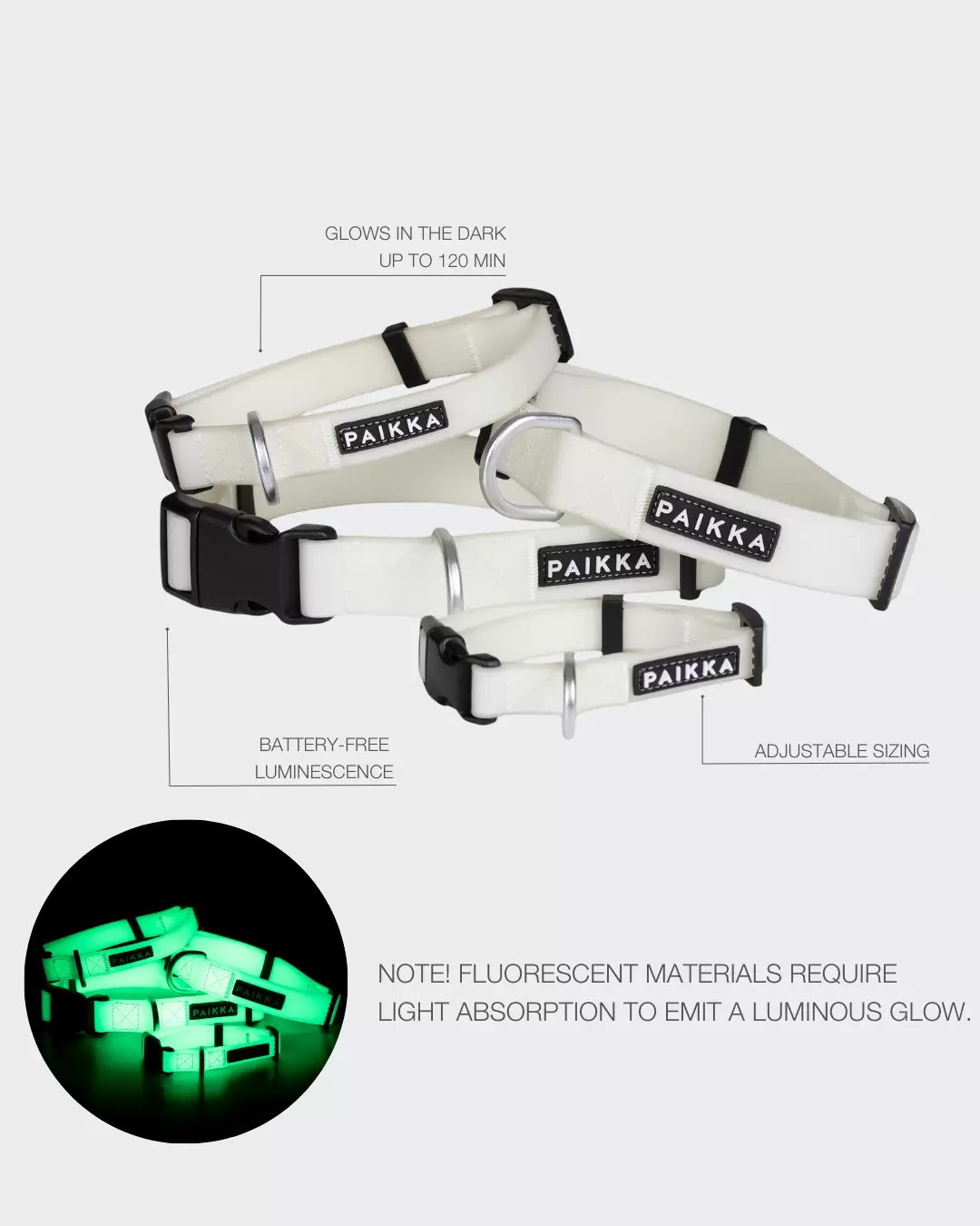 Tämä fluoresoivasta materiaalista valmistettu PAIKKA Glow-kaulapanta imee valoa ja hohtaa kirkkaasti pimeässä varmistaen näkyvyyden hämärässä. PAIKKA Glow Collar ei ole vain visuaalisesti näyttävä, vaan se on myös suunniteltu käytännöllisyyttä ja kestävyyttä ajatellen. Koko on säädettävissä mukavan ja turvallisen istuvuuden takaamiseksi.