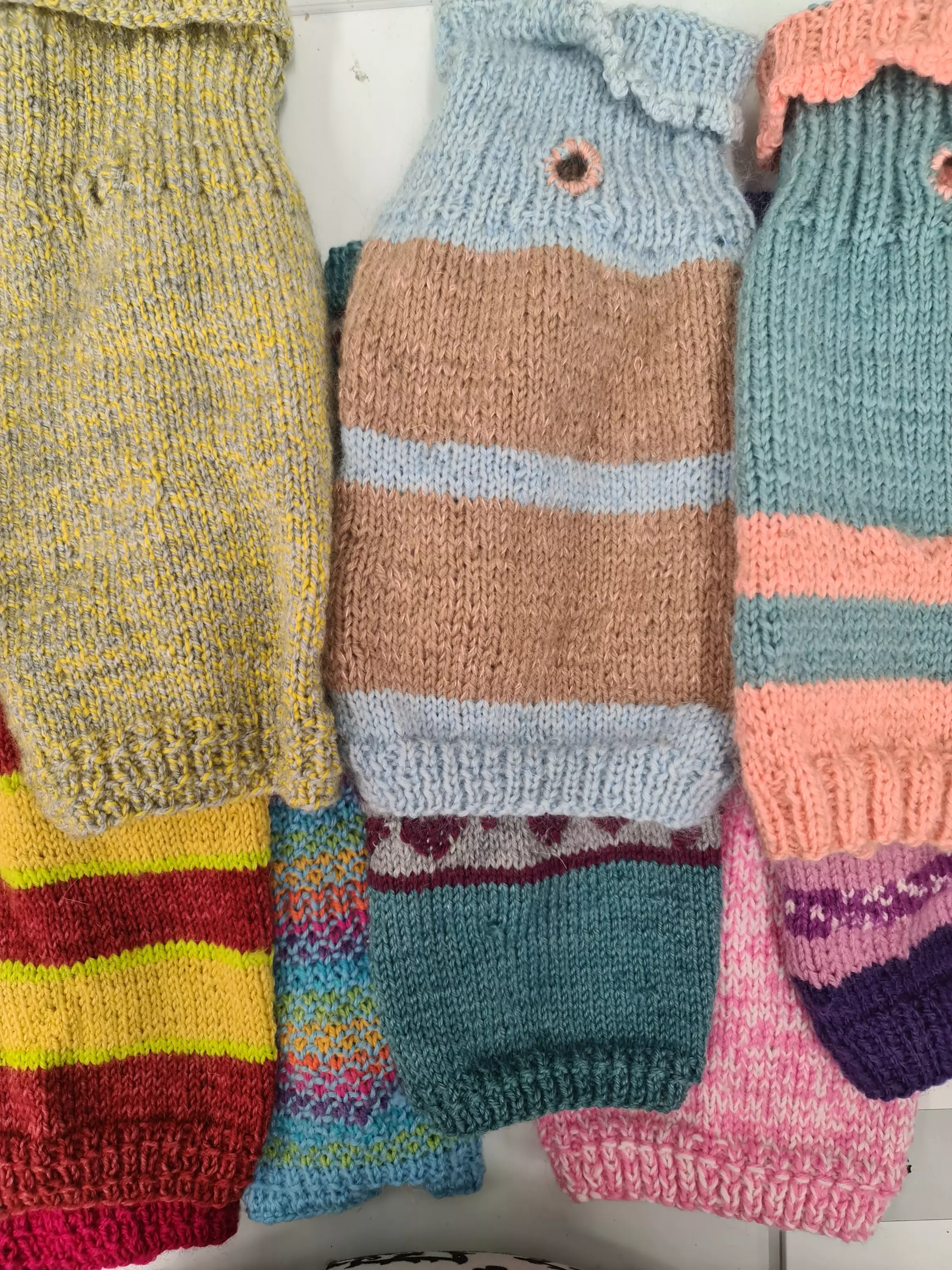 Käsinneulotut villapaidat koirille ja kissoille.
