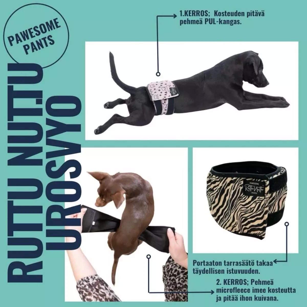 Urosvyö on tehokas ratkaisu suojaamaan sisätiloja koiran virtsankarkailulta ja merkkailulta. Se on suunniteltu erityisesti käytettäväksi tilanteissa, joissa uroskoira merkkailee sisälle, matkalla, koirankoulutushallissa tai vaikka juoksuisen nartun aiheuttaman hormonimyrskyn vuoksi. Vyö toimii myös erinomaisesti virtsankarkailusta kärsiville koirille.