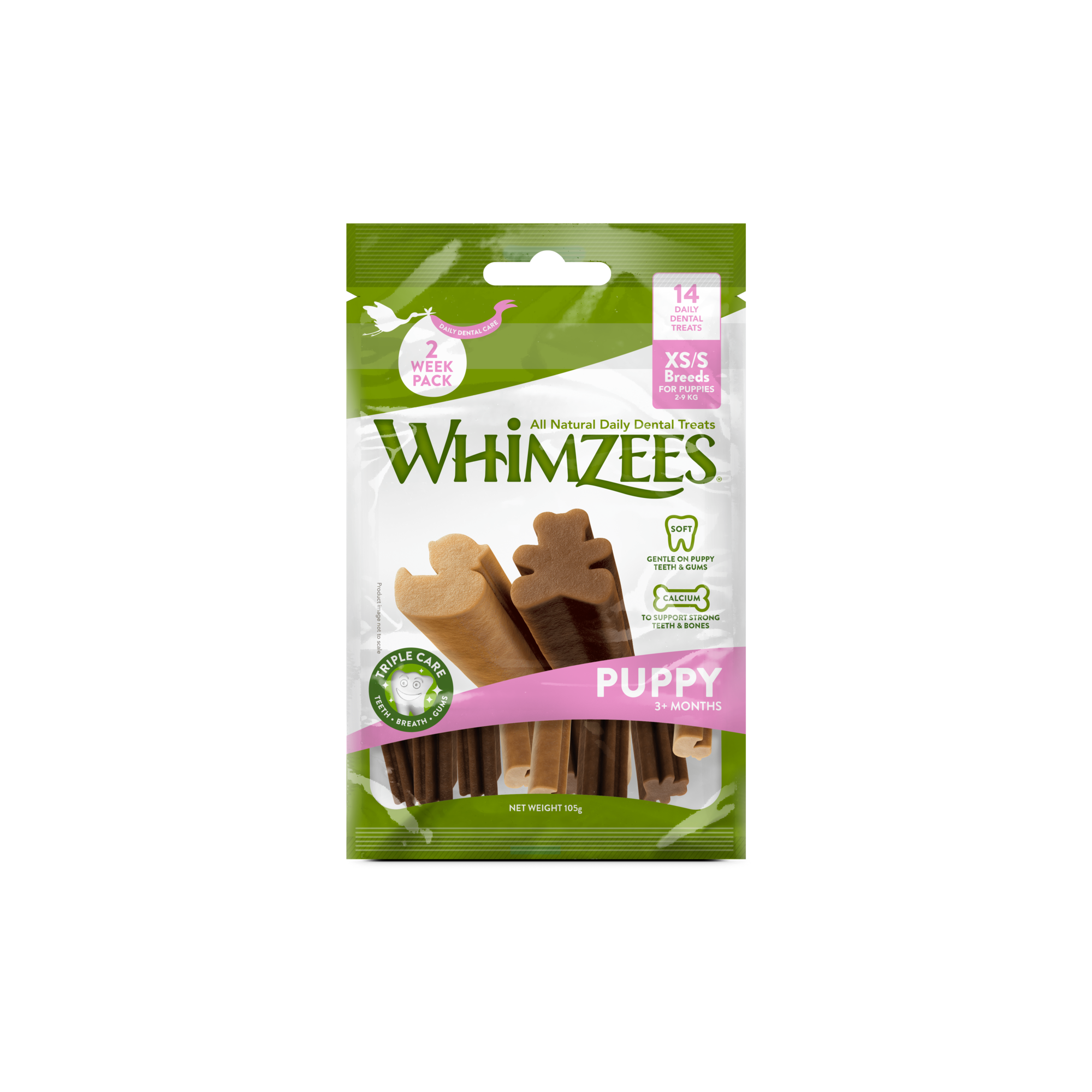 "WHIMZEES -puppy herkut on suunniteltu puhdistamaan pennun hampaat sekä vähentämään plakkia ja hammaskiveä niitä pureskeltaessa. Luonnollinen, terveellinen johdatus päivittäiseen... Lue lisää