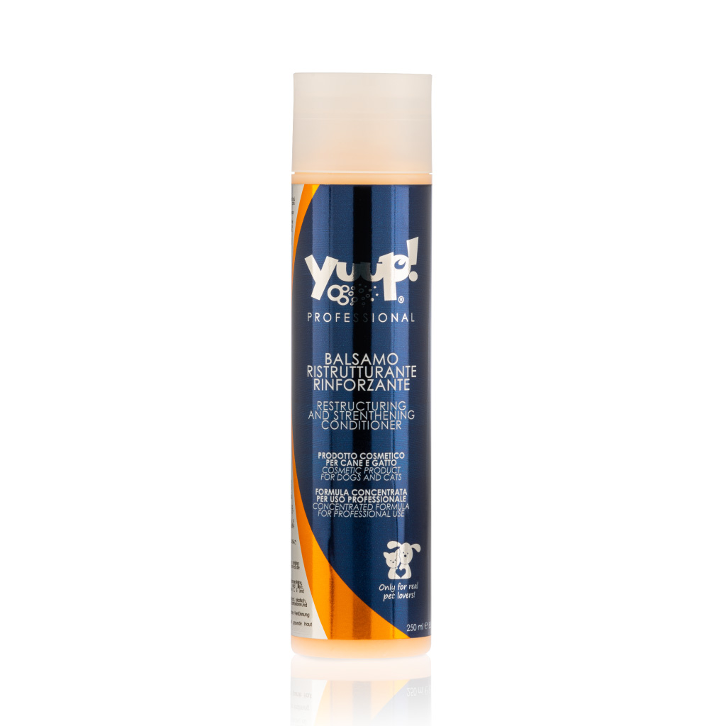 Yuup Professional sarjan Restructuring and strengthening on laadukas hoitoaine ravitsemaan ja korjaamaan karvaa. Sopii erityisen hyvin vaurioituneelle tai rasittuneelle karvalle. Verrattuna normaaliin Detangling Conditioner hoitoaineeseen, tämä antaa enemmän laskeutuvuutta turkille.