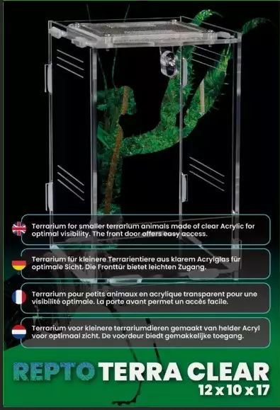 Repto Terra Clear on pienikokoinen akryyliterraario, joka soveltuu pienille terraarioeläimille. Terraarion yläosa on verkkopanelia joka parantaa ilmanvaihtoa ja mahdollistaa valaisimen asentamisen terraarion päälle. Terraarium mukana tulee akryylilevy jonka voit asettaa terraarion päälle ja säädellä sillä terraarion ilmanvaihtoa ja kosteutta tarpeen mukaan. Terraarion etupanelissa on ovi joka helpottaa pienen terraarion hoitamista. Terraario toimitetaan osissa litteässä pakkauksessa ja sen kokoaminen onnistuu ilman työkaluja. Noudata lajin vaatimuksia lämmön ja kosteuden suhteen. Käytä vain terraarioihin tarkoitettuja lamppuja ja vältä hiovia puhdistusaineita akryylipinnoilla jotta ne eivät naarmuunnu.